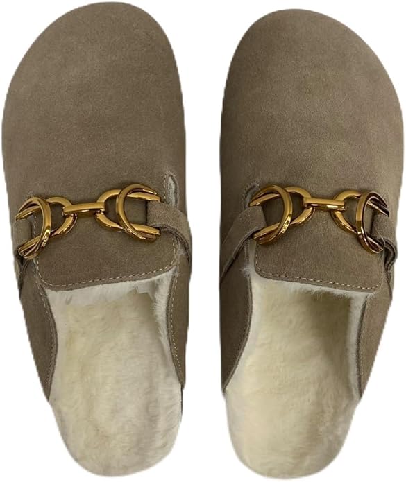 OS1820 Khaki OOG Damen Leder Hausschuhe Slipper Clogs mit Teddyfelldecksohle